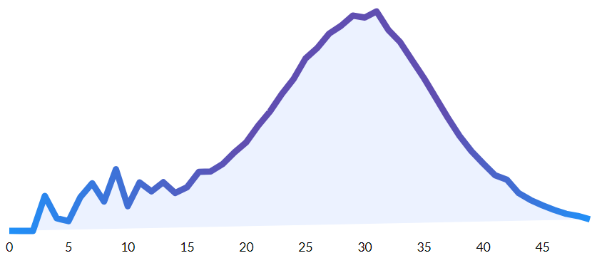 1. 평균적으로 한 웹페이지에서 사용하는 태그의 개수는 아래와 같은 분포를 보이고, 32개인 경우가 가장 많다.