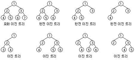 - 리프 노드를 제외한 모든 노드들이 2개의 자식 노드를 갖고 있는 이진 트리