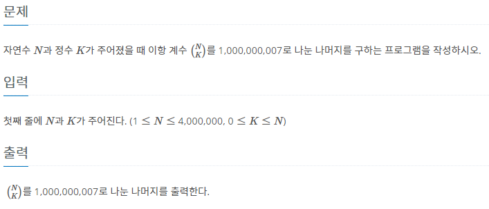 이를 어떻게 적용시킬 수 있을까 생각하던 중에 이항 계수를 계산하기 위해선 분자에 N!, 분모에 K! * (N-K)!이 온다는 것을 생각했다. 여기서 A = N!, B = K! * (N-K)!이고, A * B^(-1)이 이항 계수의 값이었다. 그리고 이를 P(1,000,000,007)로 나누어야 하기 때문에 {( A % P ) * ( (B^-1) % P )} % P를 구하면 되는 문제로 바꿀 수 있었다. 여기서 큰 수의 나머지를 구하는 공식은 아래와 같다.