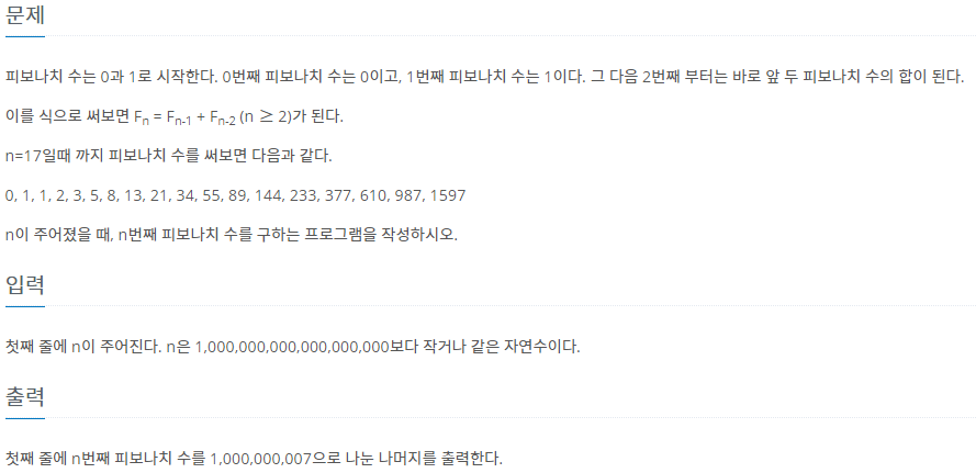 이 문제는 평범한 재귀 호출이나 동적 계획법과 같은 연산을 통해 구하기가 쉽지 않다. 문제 조건에서 볼 수 있듯이 Fn을 구하는데, 해당 n이 최대 10^17(10의 17제곱)까지 가능하기 때문이다. 또한 피보나치 수열은 궁극적으로 앞의 연속된 두 숫자를 알아야만 그 다음 숫자를 구할 수 있고, 앞의 연속된 두 숫자는 또 해당 숫자의 앞의 연속된 두 숫자를 알아야만 연산이 가능하다. 즉, 기존의 피보나치 수열 개념( Fn = Fn-1 + Fn-2 (n ≥ 2) )은 연쇄적으로 연산이 되기 때문에, 각각의 독립된 소문제 해결을 통해 큰 문제를 해결하는 일반적인 분할 정복 방식도 적용하기가 쉽지 않다.