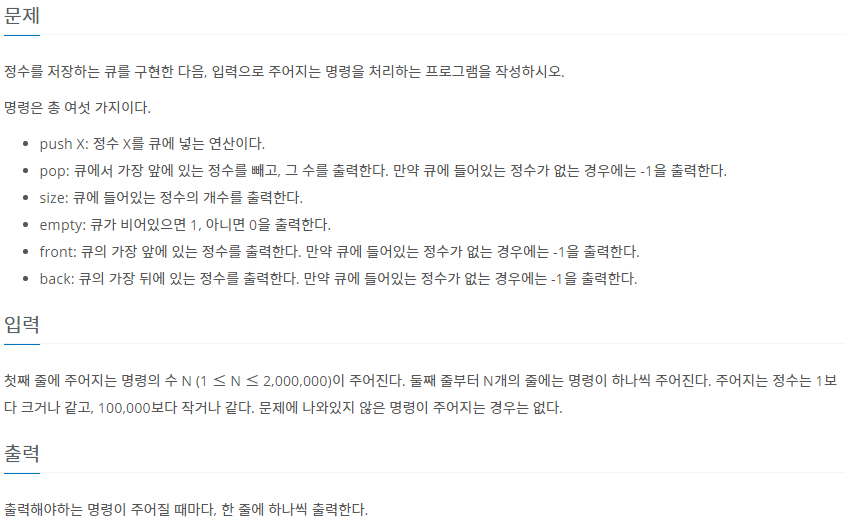 큐 2 시간 제한 메모리 제한 제출 정답 맞은 사람 정답 비율 파이썬 : 3 초 512 MB 1730 610 482 37.923% 문제 정수를 저장하는 큐를 구현한 다음, 입력으로 주어지는 명령을 처리하는 프로그램을 작성하